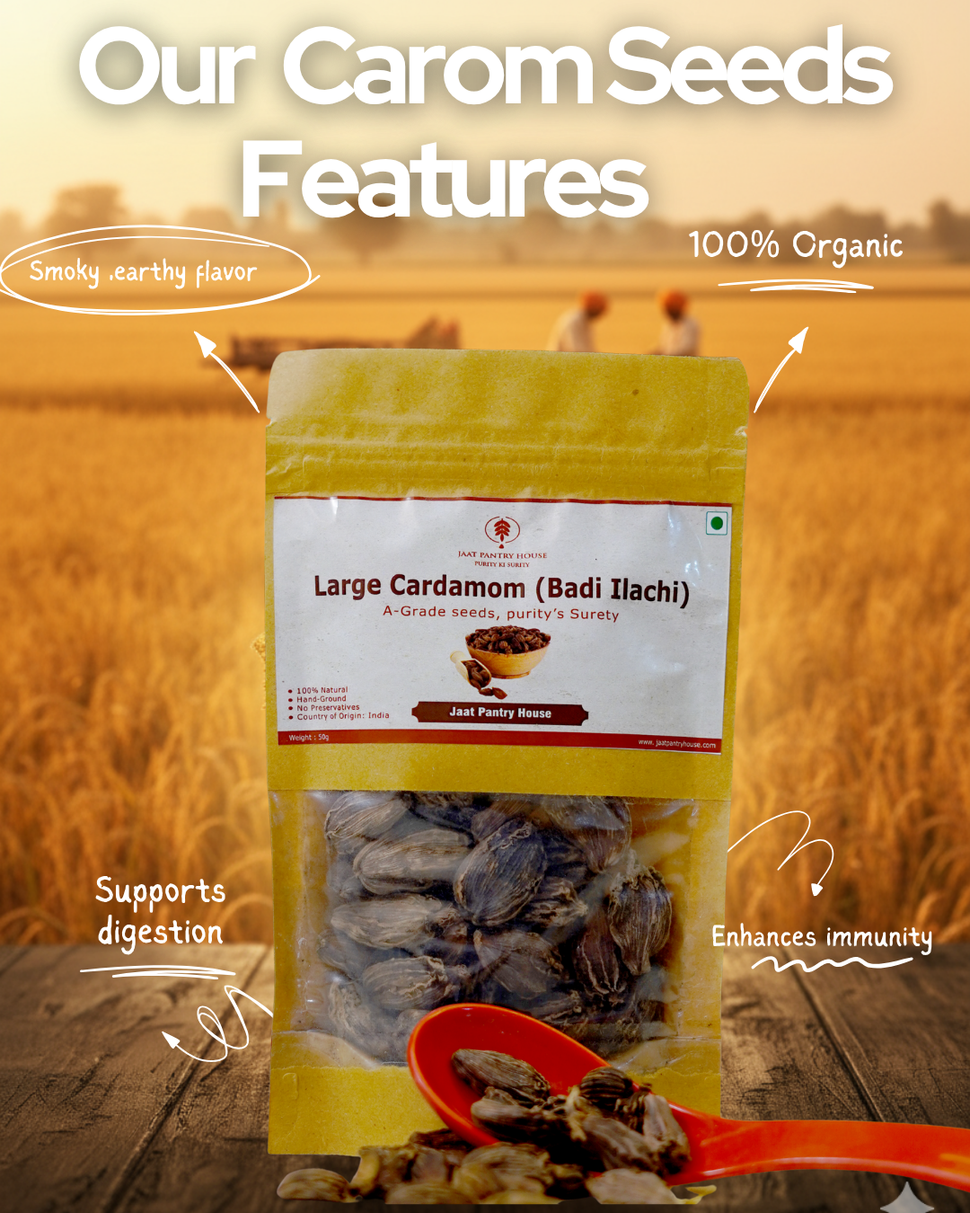 JPH Black Cardamom is handpicked from organic farms, sun-dried to preserve its smoky